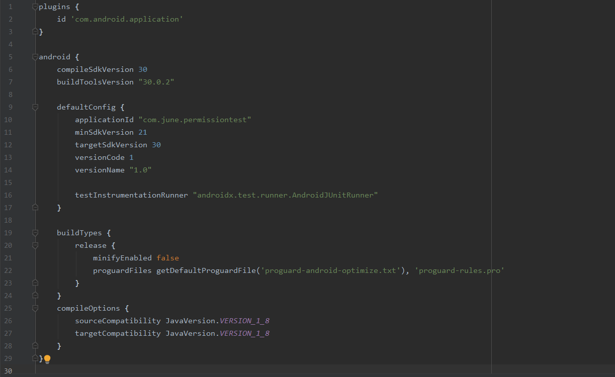 - compileSdkVersion : 빌드를 진행할 때 어떤 버전의 SDK를 사용할 것인지 지정 (보통 최신 버전 지정)