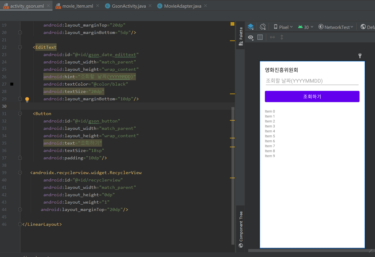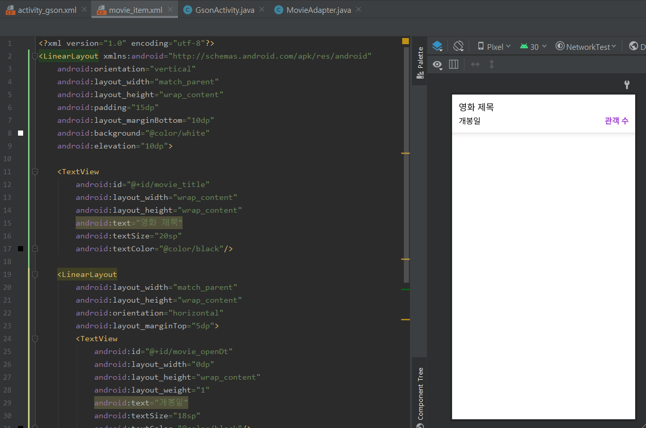- 미리 만들어 둔 화면에 필요한 영화 제목, 개봉일, 관람객 수에 대한 TextView를 ViewHolder에서 연결함