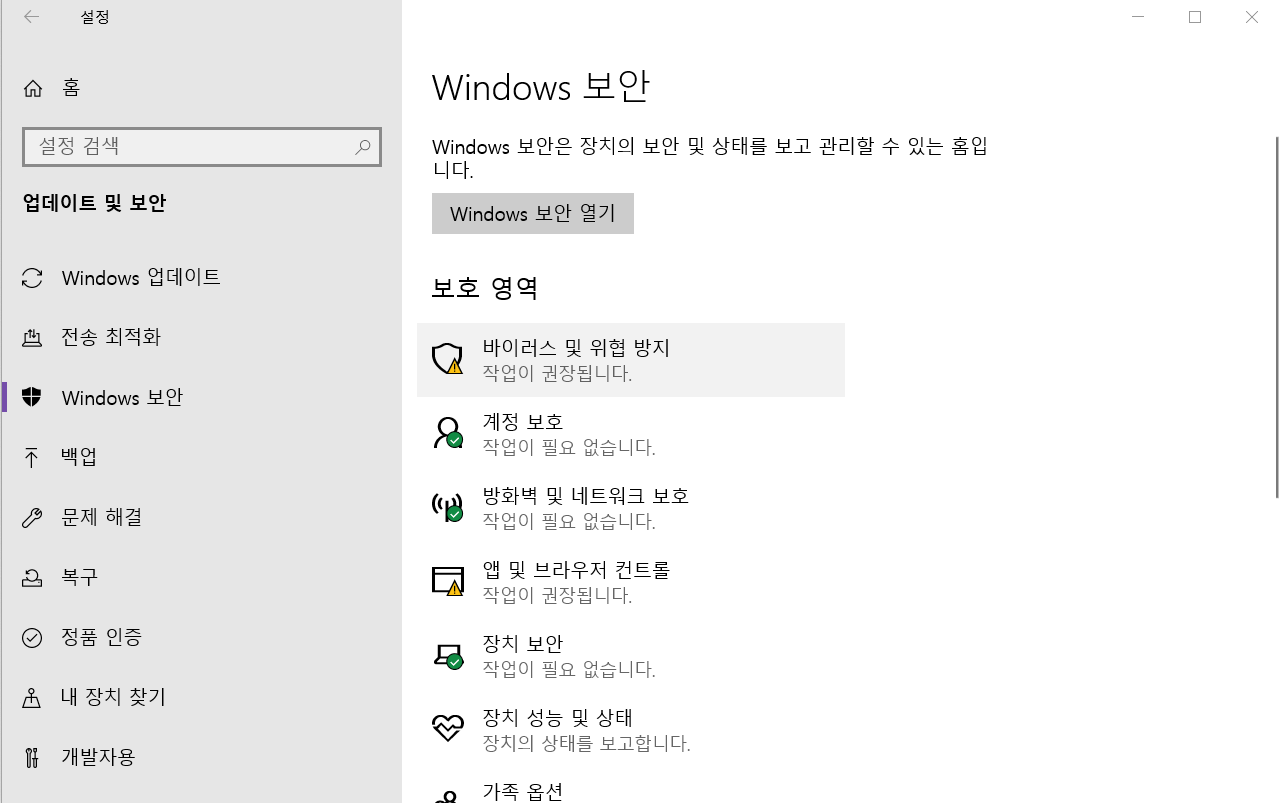 나는 anti-virus 프로그램이라곤 따로 설치하지 않았기 때문에 기본적인 프로그램만 사용하고 있다.