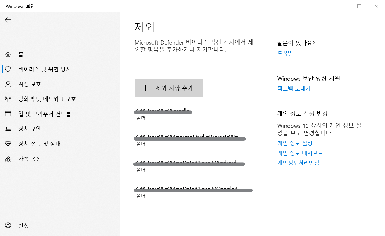 설정(Setting) > 업데이트 및 보안 > Windows 보안 > Windosw 보안 열기 > 바이러스 및 위협 방지 > 바이러스 및 위협 방지 설정 > 제외(제외 추가 또는 제거) > 제외 사항 추가