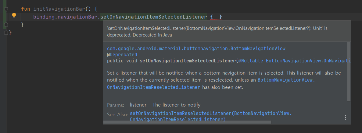BottomNavigation의 리스너인 setOnNavigationItemSelectedListener를 이용하여 select 이벤트를 완성하려고 했는데, 이번에 업데이트를 하면서 deprecated 된 것을 발견했습니다.