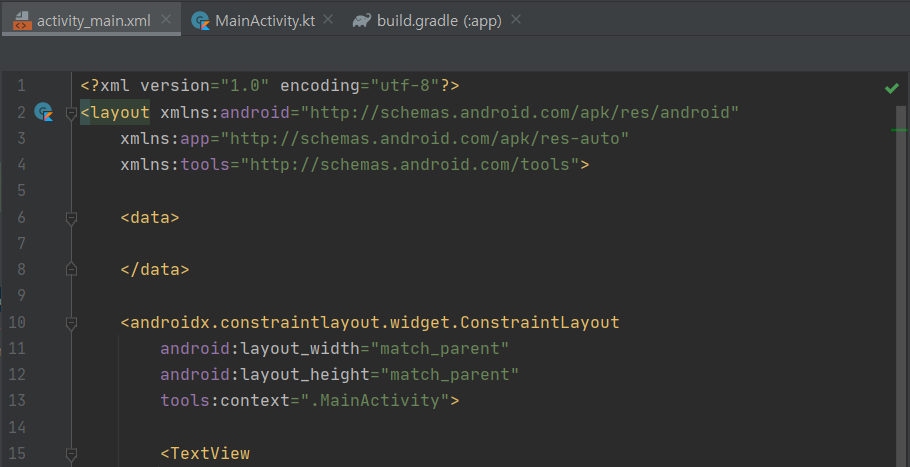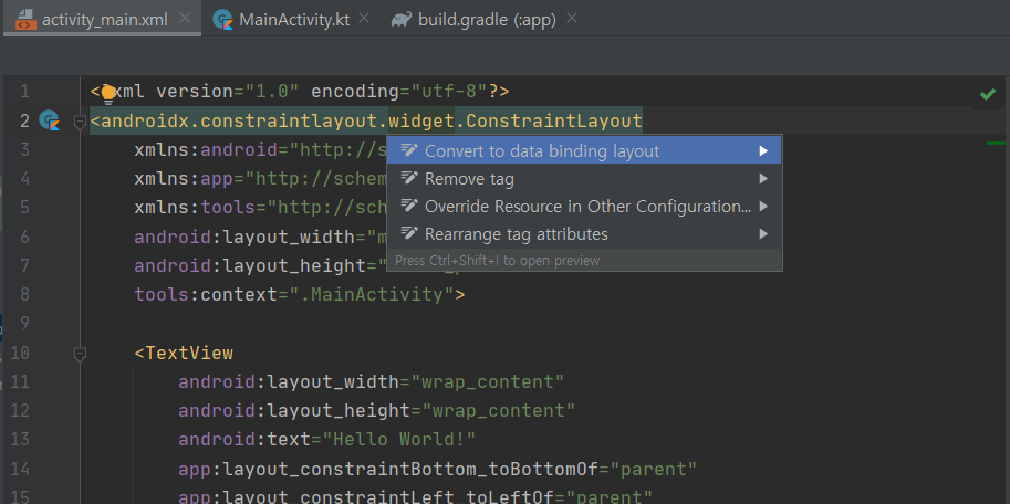 최상위 레이아웃에서 ALT+ENTER를 누르고 'Convert to data binding layout'을 누르면 <layout> 태그가 생성된다.