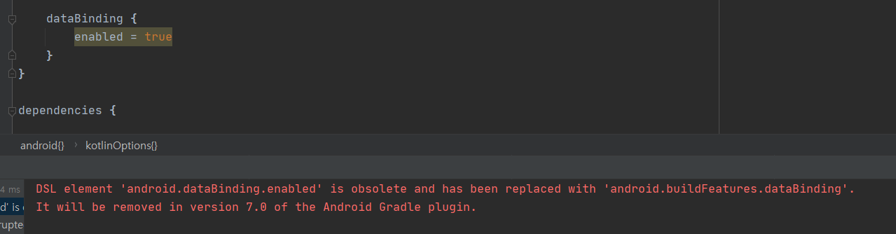 공식문서에서는 아래와 같은 코드로 라이브러리를 가져오라고 되어 있었지만 빌드해보니 'android.dataBinding.enabled'는 쓸모없다(?)고 하며 'android.buildFeatures.dataBinding'으로 교체되었다고 한다. 찾아보니 안드로이드 4.0 부터는 위의 방식으로 사용한다고 한다.