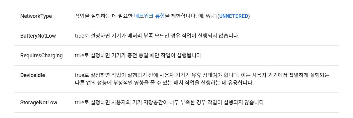 - 제약조건과 task를 연결하기 위해서는 Constraint.Builder()를 사용하여 Constraints 인스턴스를 만들어야 함