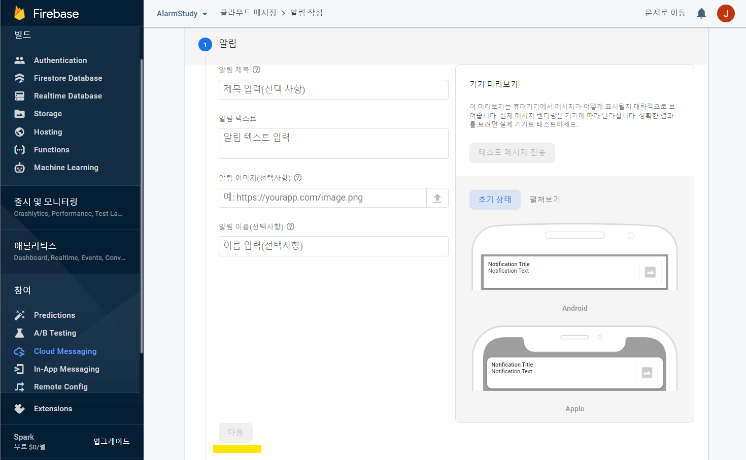 기존 Firebase의 프로젝트 설정과 동일하므로 앞의 과정은 생략한다.
