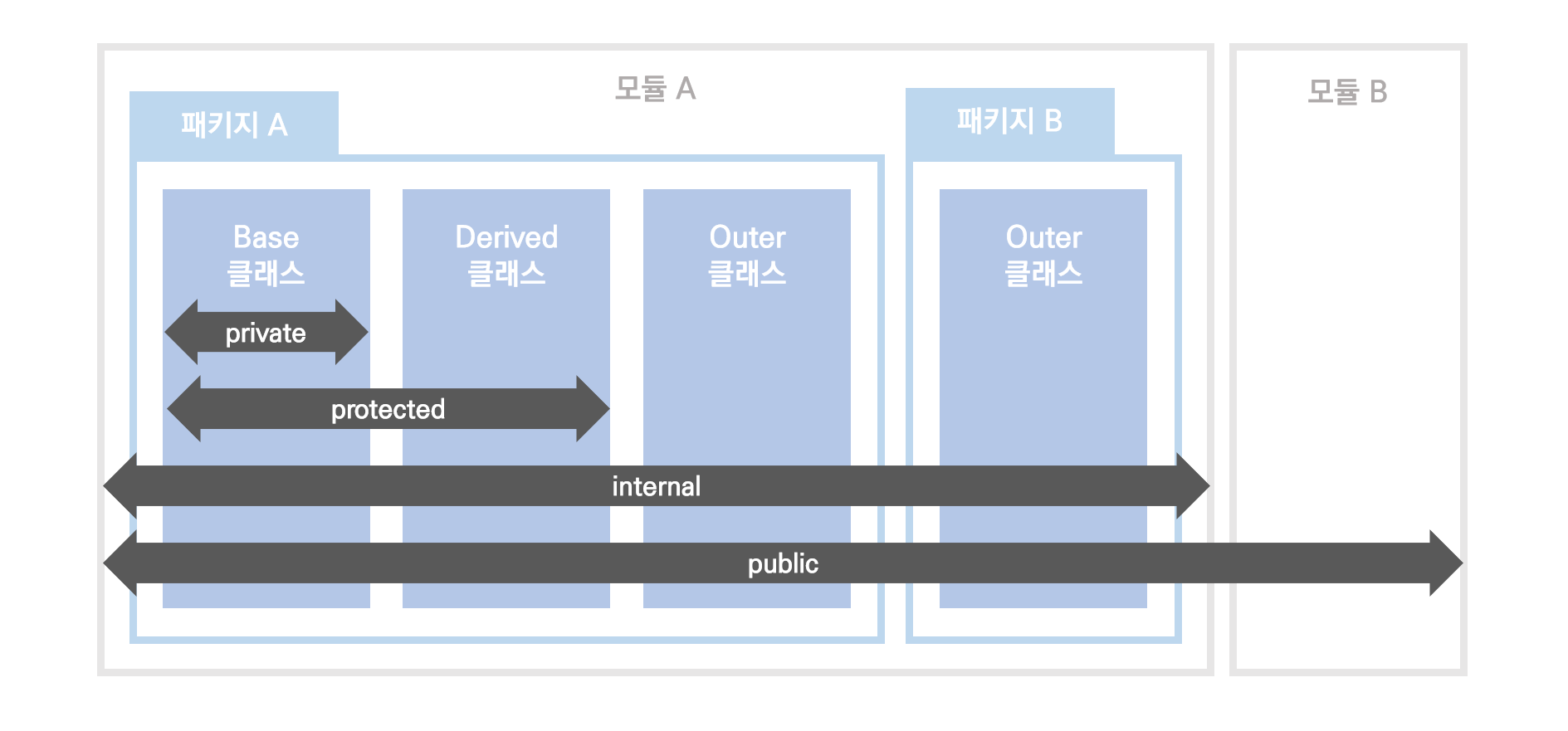 * 기존의 자바에서는 package라는 지시자에 의해 패키지 이름이 같은 경우에 접근을 허용함* 코틀린에서는 패키지에 제한하지 않고 하나의 모듈 단위를 대변하는 internal를 사용