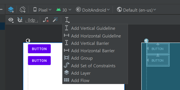 [Add Vertical Guideline] 으로 세로 가이드라인을 만들고 Button의 왼쪽을 가이드라인에, 위쪽은 각각의 위쪽에 연결해주었음