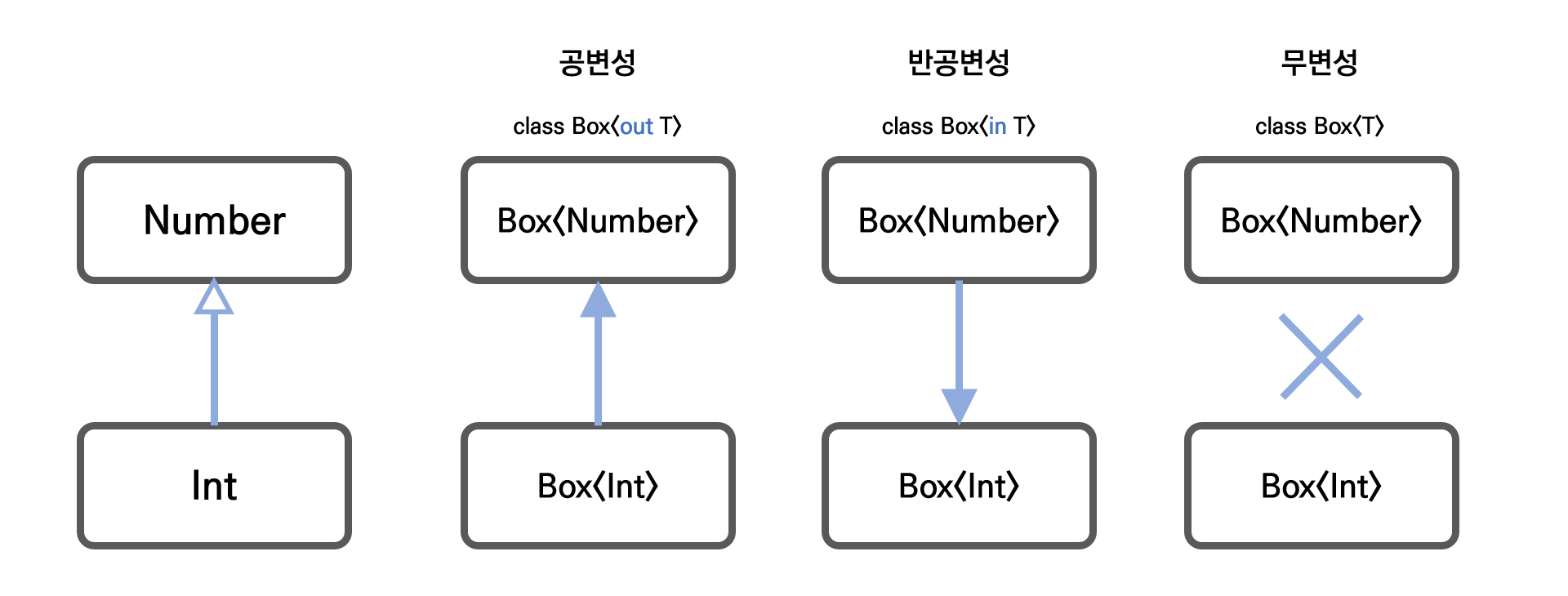 - Any의 하위 클래스인 Int는 공변성을 가지므로 Box<Any>에 Box<Int> 자료형을 할당할 수 있음