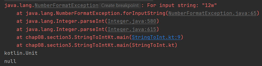 - 숫자가 아닌 문자가 포함되었을 때 null로 반환받으려면 toInt() 대신 toIntOrNull()을 사용하면 프로그램 중단을 방지할 수 있음