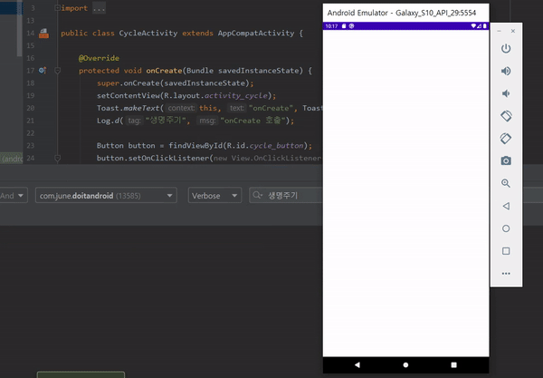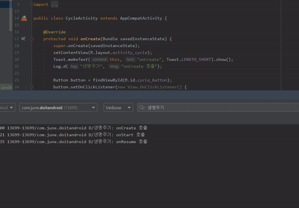 - 화면이 보일 때 : onCreate → onStart → onResume