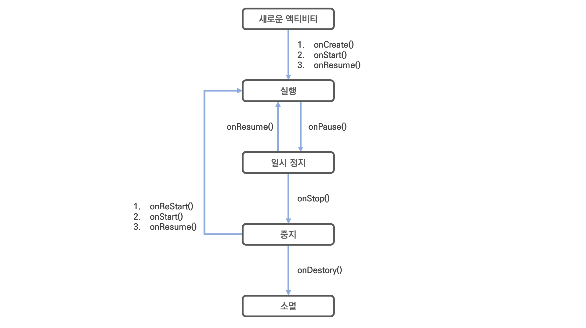액티비티는 처음 실행될 때 메모리에 만들어지는 과정부터 시작해서 실행, 중지, 메모리에서 해제되는 여러 과정의 상태 정보를 갖고 있음. 이런 상태 정보는 시스템이 관리하면서 각각의 상태에 해당하는 메서드를 자동으로 호출함.