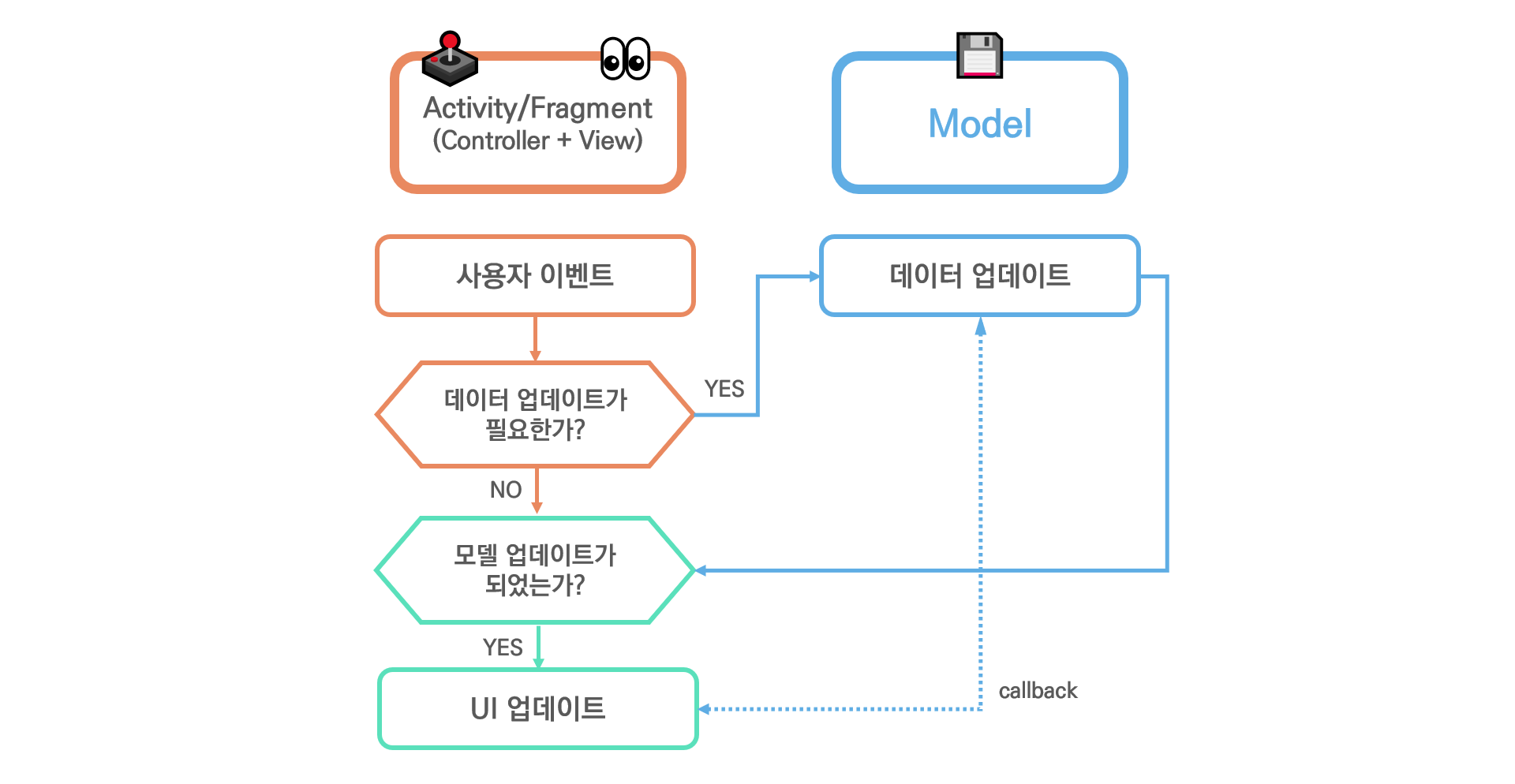 안드로이드는 Activity/Fragment가 View와 Control의 역할을 동시에 수행한다.