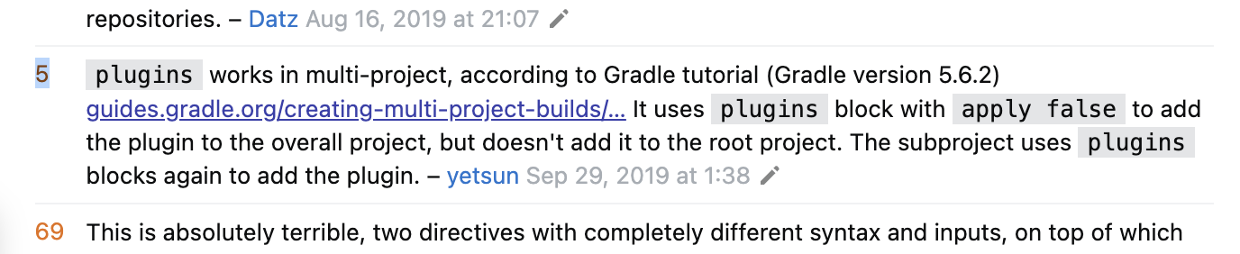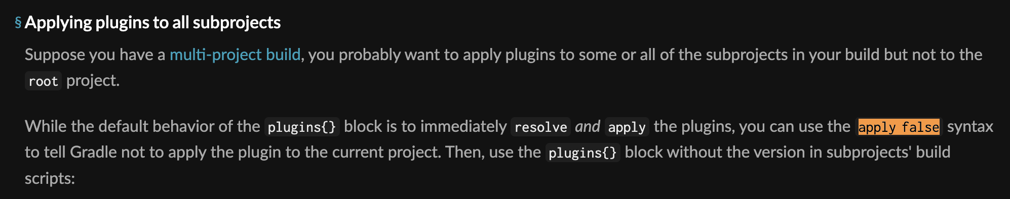 - stack overflow의 한 답변에서는 'apply false는 프로젝트 전반에는 적용하지만 root project에는 하지 않는 플러그인에 사용한다. 다시 sub project의 plugins 블록에 플러그인을 추가해서 사용한다' 라고 말하고 있다.