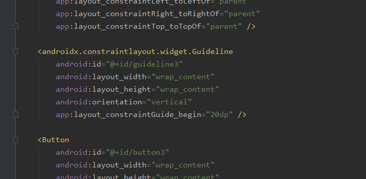 - layout_constraintGuide_begin : 세로 방향인 경우 왼쪽부터, 가로 방향인 경우 위쪽부터의 거리 지정