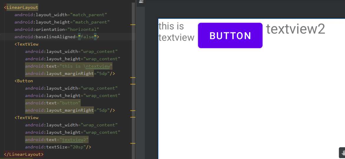 - layout_alignBaseline : 지정한 View와 내용물의 아래쪽 기준선을 맞춤
