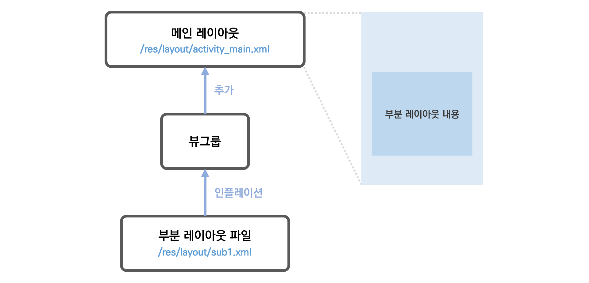 - 일부 화면을 분리한 화면(sub1.xml)은 LayoutInflater 객체를 사용해 ViewGroup으로 객체화(인플레이션)한 후 메인 레이아웃에 추가