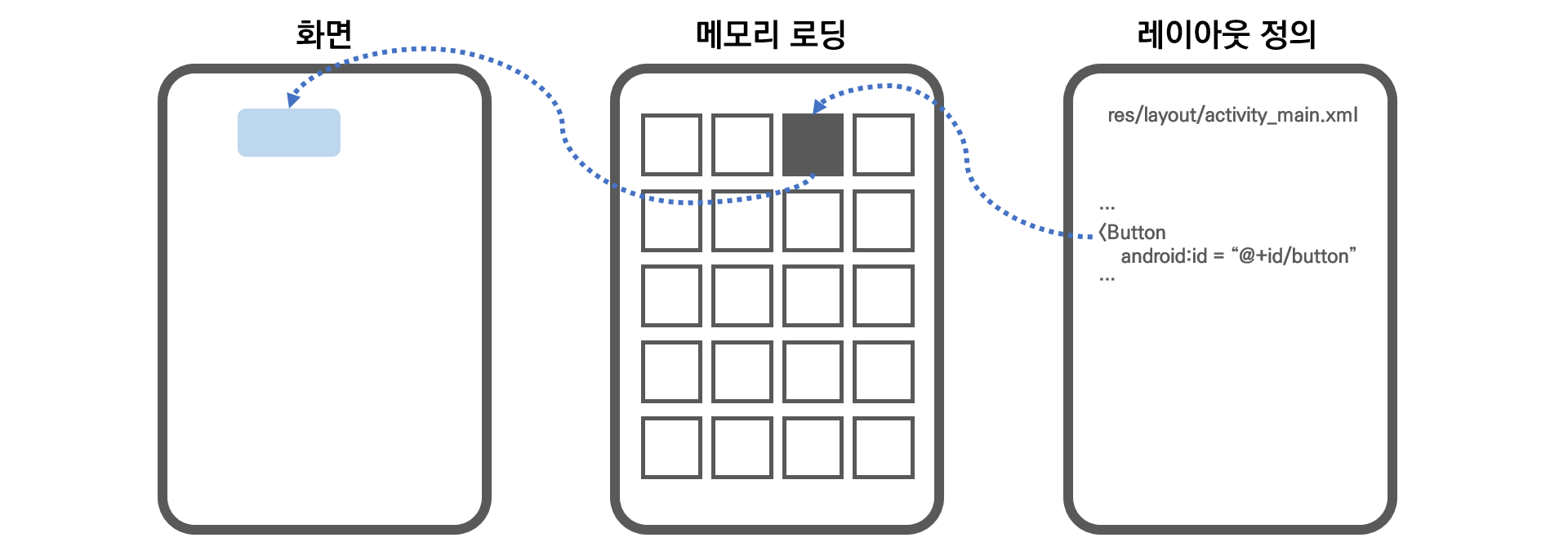 앱이 실행될 때 XML 레이아웃의 내용이 메모리에 객체화되고 객체화된 XML 레이아웃을 소스파일에서 사용함