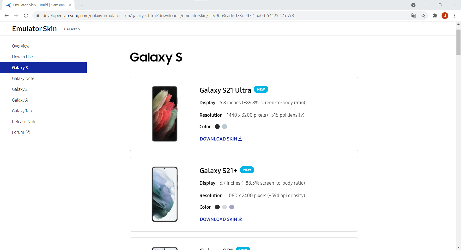 1. 갤럭시 Developer 사이트에 들어가서 원하는 기기를 선택한다